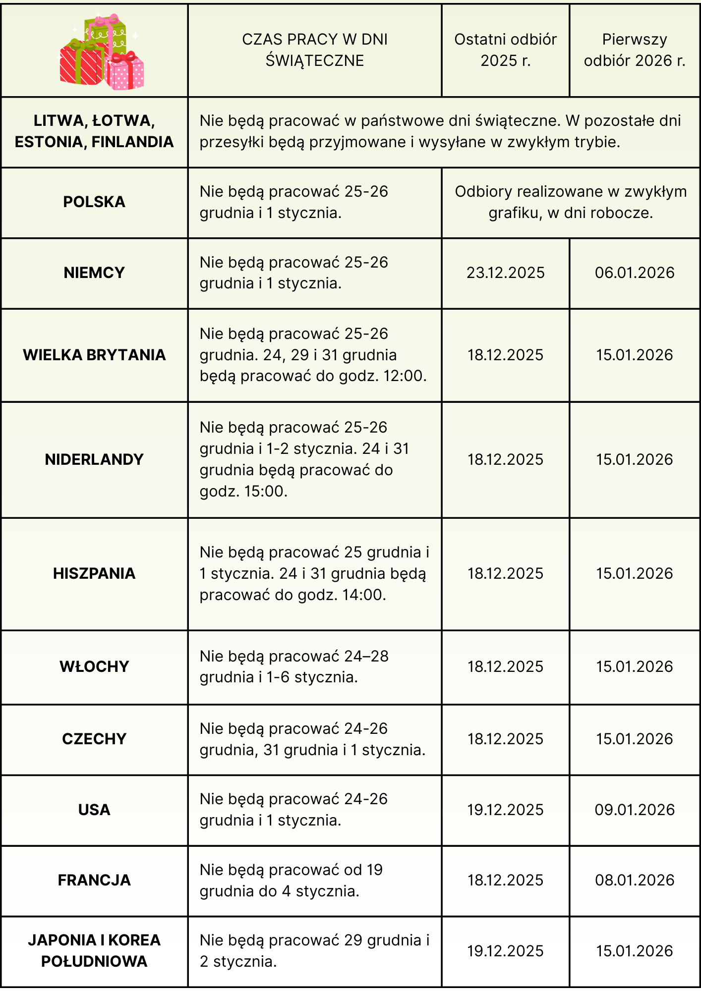 W związku ze zbliżającym się okresem świątecznym chcemy poinformować o zaktualizowanym harmonogramie odbioru przesyłek, aby zamówione paczki dotarły do Państwa na czas i bez dodatkowych kłopotów.
